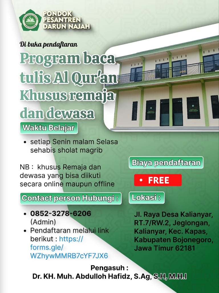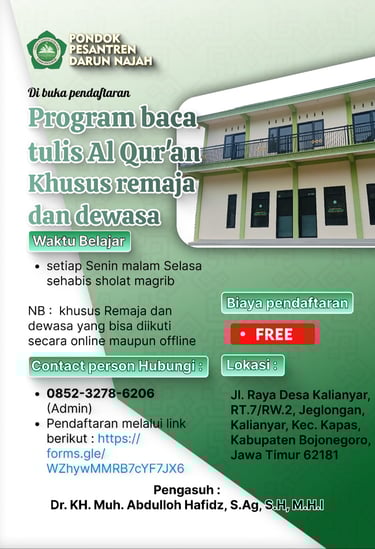 Pondok Pesantren Darun Najah membuka Program Baca Tulis Al-Qur’an Khusus untuk Remaja dan Dewasa Belajar dengan metode yang mudah, suasana yang nyaman, dan pembimbing yang berpengalaman.
