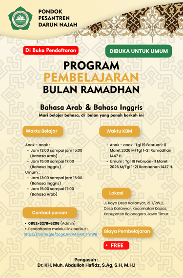 "Pondok Pesantren Darun Najah membuka pendaftaran program belajar Bahasa Arab dan Bahasa Inggris edisi bulan Ramadhan. Daftar sekarang untuk mempersiapkan masa depan serta mencari barokah di bulan Ramadhan!"